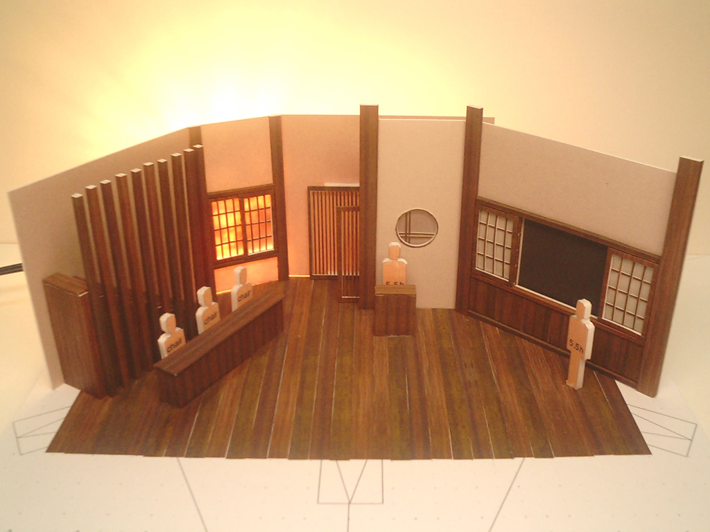 「和の伝統」らしさを出したいと思い、全体的に日本の旧家をイメージして作りました。木材には古びた感じの加工を施します。壁のパネルは土壁のような表面にし、また、上手側(手前)の壁の色を下手側(奥)よりも明るくすることで、奥行きが出るようにしました(正面写真参照)