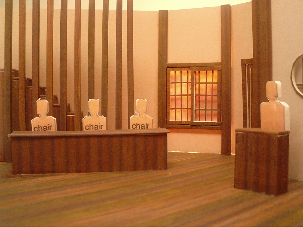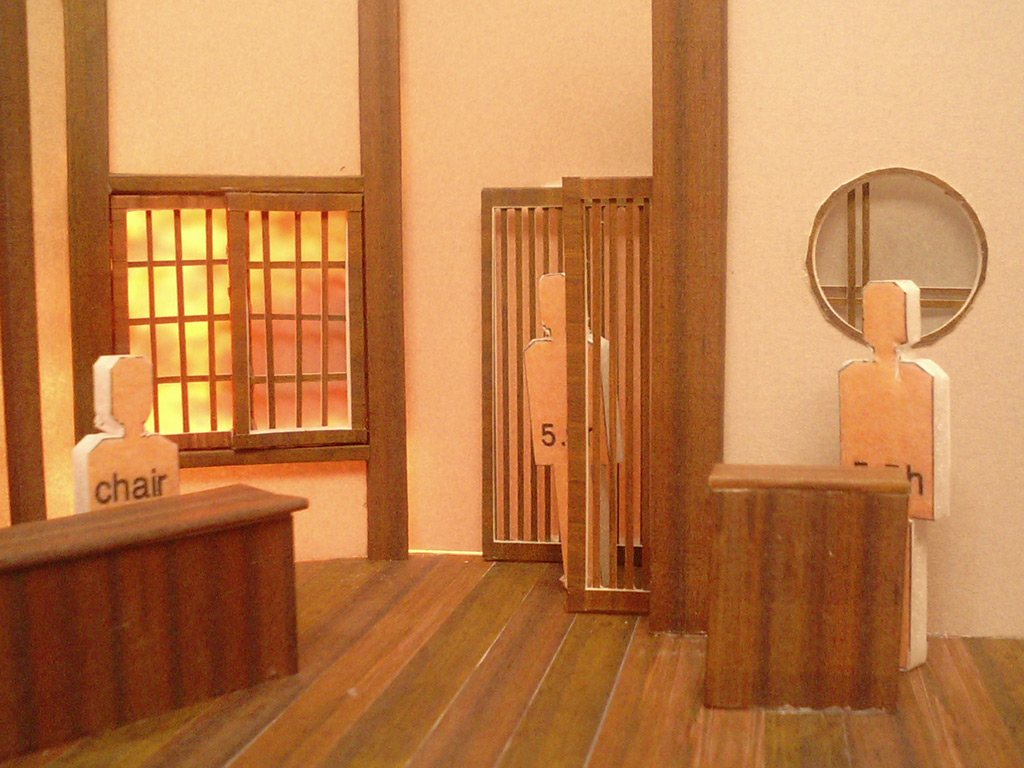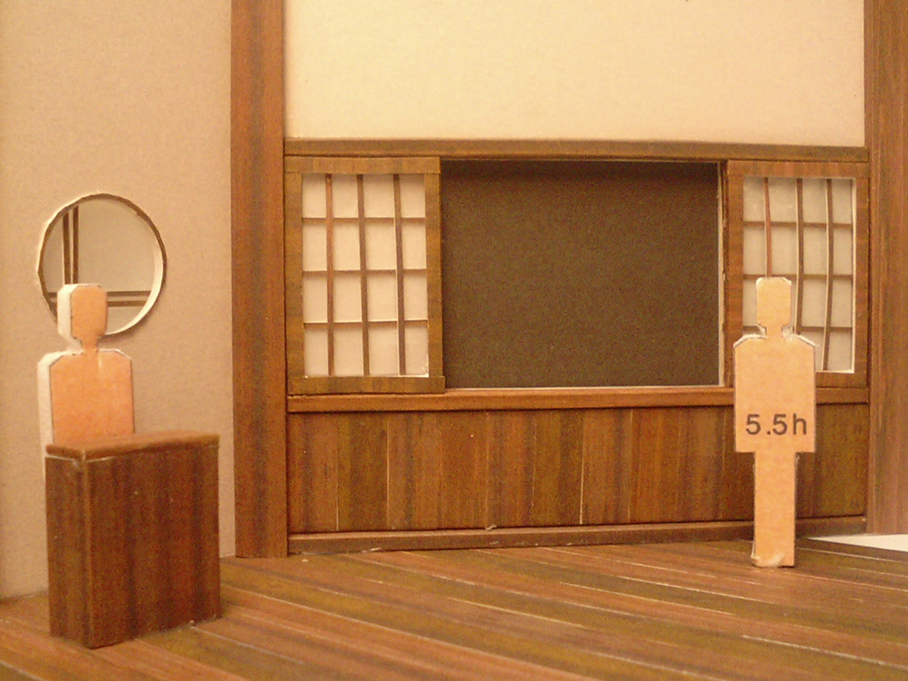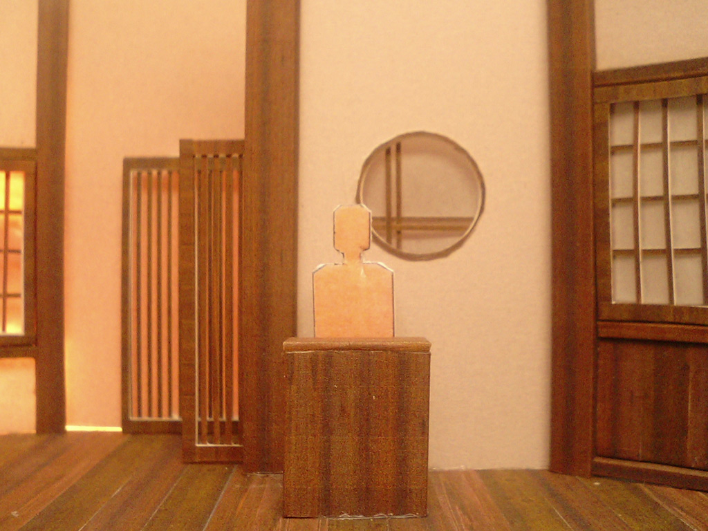 「和の伝統」らしさを出したいと思い、全体的に日本の旧家をイメージして作りました。木材には古びた感じの加工を施します。壁のパネルは土壁のような表面にし、また、上手側(手前)の壁の色を下手側(奥)よりも明るくすることで、奥行きが出るようにしました(正面写真参照)